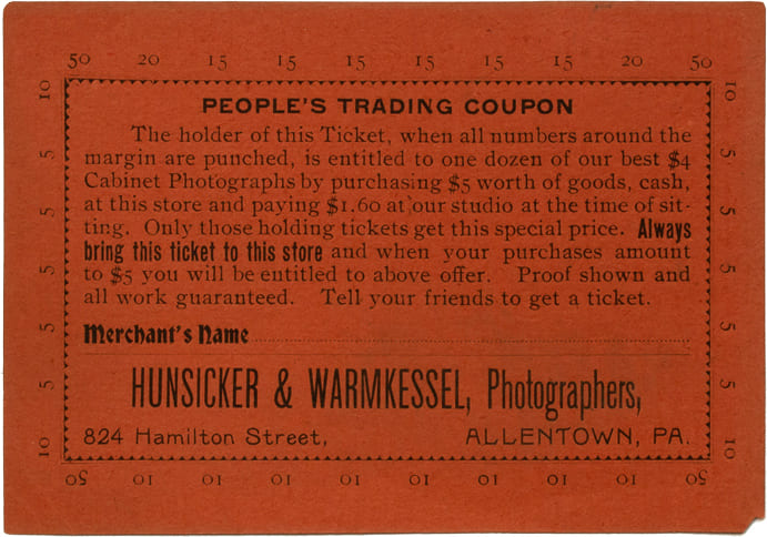 By the 1890s, even photographers were joining in. Hunsicker & Warmkessell in Philadelphia offered punch cards that could be exchanged for a dozen premium cabinet photographs. That’s the 19th-century version of “Buy 2, Get 1 Free” offers we see now!