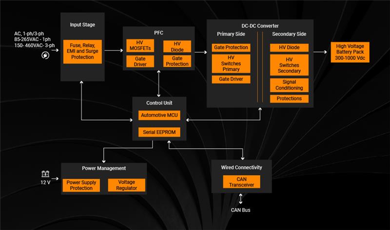 High-Performance AC-to-DC Conversion: The On-Board Charger (OBC) enables Battery Electric Vehicles and Plug-in Hybrid Electric Vehicles to draw power from standard AC sources, whether at residential, commercial, or public charging stations and converts it into the precise DC voltage and current required by the vehicle’s battery pack.